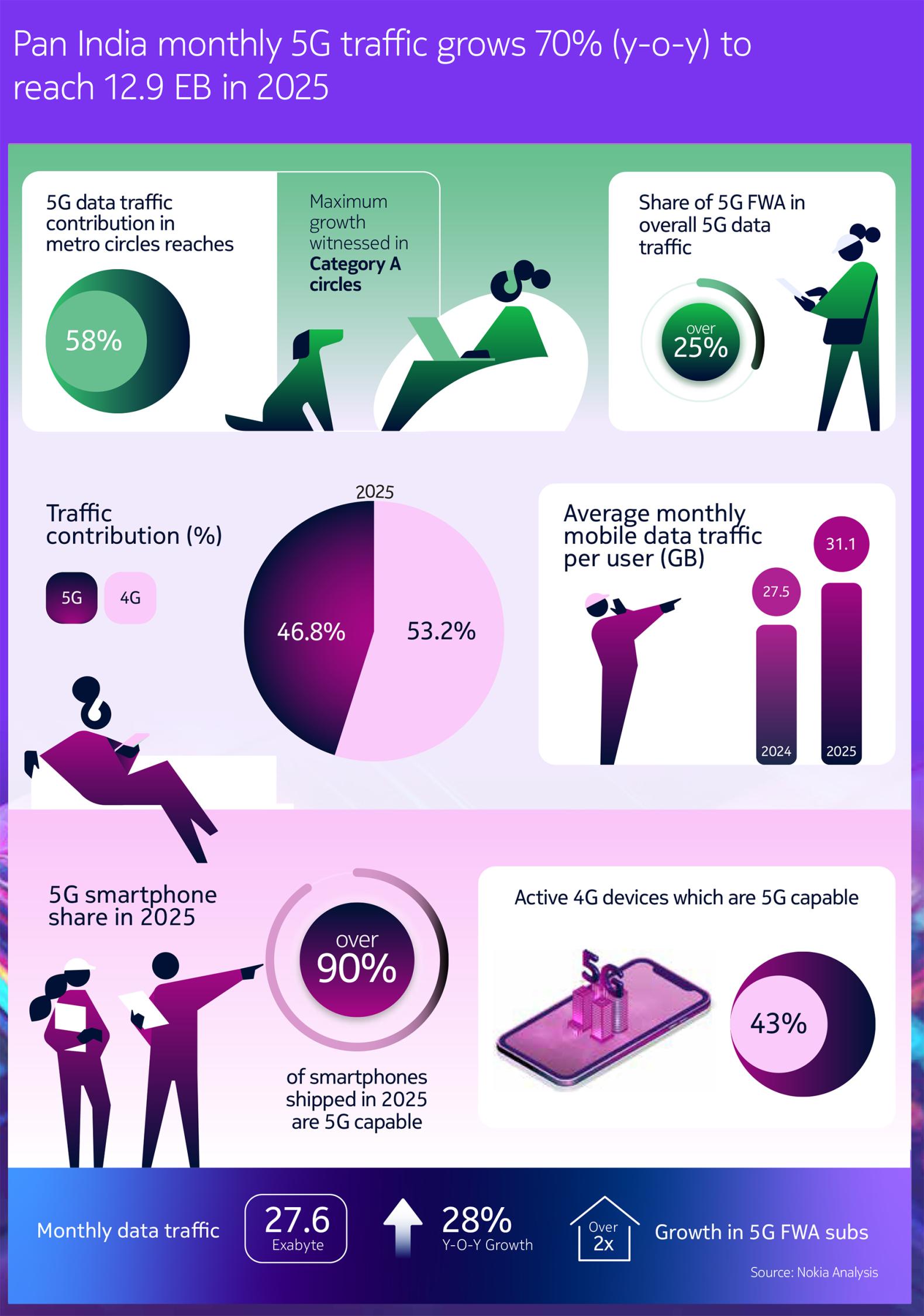 - FWA (Fixed Wireless Access) contributes over 25% in the overall 5G data traffic